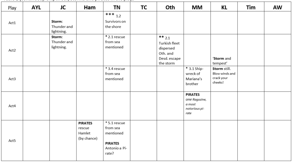 A fatal outcome is very much the exception. Of course, there is the sinking of Antigonus’s ship off the coast of Bohemia in The Winter’s Tale, which prevents any news about Perdita reaching Sicily. And there is the destruction of the Turkish fleet in Othello. All other shipwreck victims not only survive, but stay unharmed.